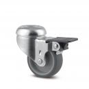 Lenkrolle mit Radfeststeller, Gehäuse aus Stahlblech, glanzverzinkt, blaupassiviert, Schwenklager mit zweifachem Kugelkranz, Radachse vernietet, Anschraubloch. Radkörper aus Polypropylen, Lauffläche aus TENTEprene (Thermoplastischer Gummi), spurlos, Gleitlager Diese Rollen können mit handelsüblichen Schrauben beliebiger Länge montiert werden.