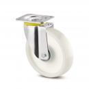 Lenkrolle, Gehäuse aus schwerem Stahlblech, verstärkt, glanzverzinkt, blaupassiviert, Schwenklager mit geschütztem zweifachem Kugelkranz, verstärkt durch gehärtete Lagerschalen, Rückenbolzen vernietet, Staubschutz mit integriertem Schmiernippel, Radachse verschraubt, Plattenbefestigung. Radkörper aus Polyamid, Präzisionskugellager