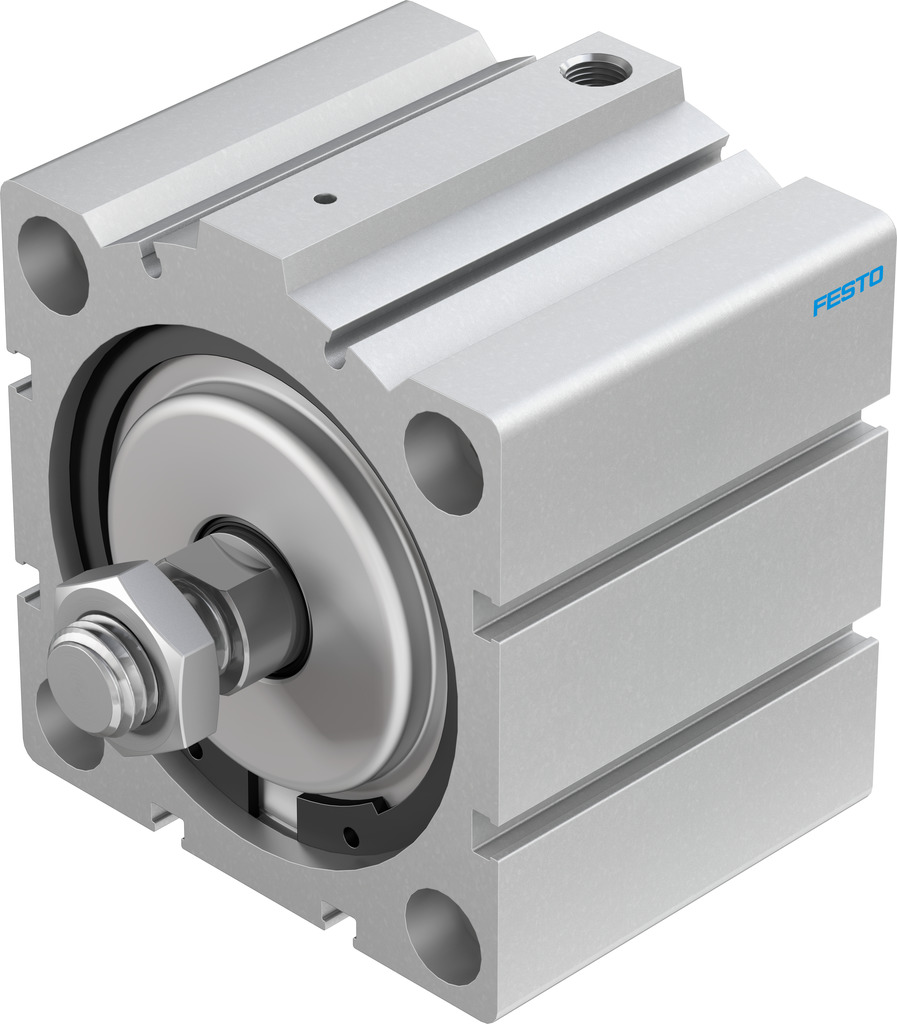 Kurzhubzylinder AEVC-80-25-A-P-A für Positionserkennung. Kolbenstangenende mit Außengewinde. Hub=25 mm, Kolben-Durchmesser=80 mm, Federrückstellkraft bei eingefahrener Kolbenstange=85 N, Basierend auf Norm=(* ISO 6431, * Lochbild, * VDMA 24562), Dämpfung=P: elastische Dämpfungsringe/-platten beidseitig