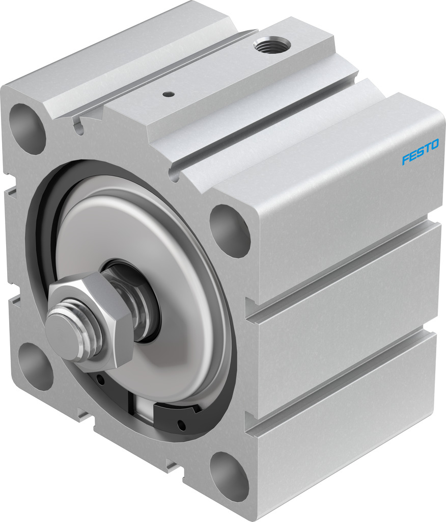 Kurzhubzylinder AEVC-80-25-A-P keine Positionserkennung. Kolbenstangenende mit Außengewinde. Hub=25 mm, Kolben-Durchmesser=80 mm, Federrückstellkraft bei eingefahrener Kolbenstange=85 N, Basierend auf Norm=(* ISO 6431, * Lochbild, * VDMA 24562), Dämpfung=P: elastische Dämpfungsringe/-platten beidseitig