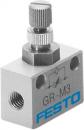 One-way flow control valve GR-M3 With flow adjustable in one direction. Valve function=One-way flow control function, Pneumatic connection, port 1=M3, Pneumatic connection, port 2=M3, Adjusting element=Knurled screw, Mounting type=(* Optional, * Front panel installation, * with through hole)