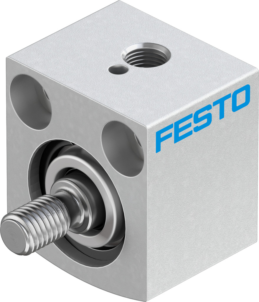 Kurzhubzylinder AEVC-12-5-A-P keine Positionserkennung. Kolbenstangenende mit Außengewinde. Hub=5 mm, Kolben-Durchmesser=12 mm, Federrückstellkraft bei eingefahrener Kolbenstange=4 N, Dämpfung=P: elastische Dämpfungsringe/-platten beidseitig, Einbaulage=beliebig